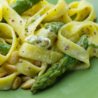 Meanwhile, combine olive oil, lemon peel, tarragon and goat cheese in a large bowl, breaking up the goat cheese as you put it in. Add hot pasta and asparagus to bowl, along with a couple slashes of the pasta water. Add toasted pine nuts and toss until smoothly combined, adding more pasta water if needed. Season generously with salt and pepper, and lemon juice if you feel it needs a little extra kick.